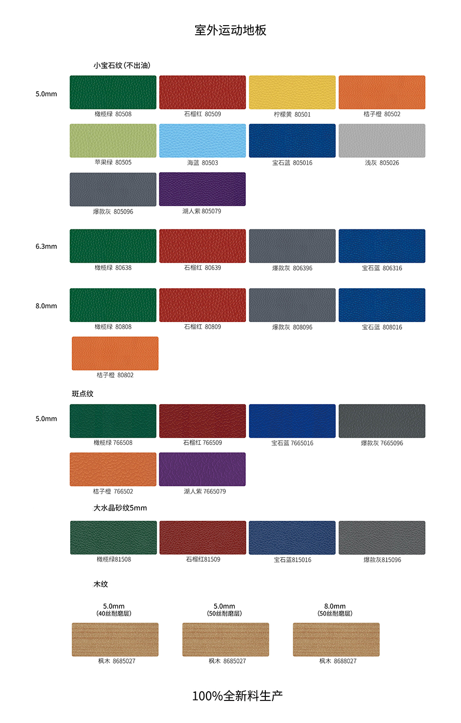 只用全新料,不用回收料,一點(diǎn)也不用。適用于乒乓球場(chǎng)、羽毛球場(chǎng)、籃球場(chǎng)、網(wǎng)球場(chǎng)、學(xué)校操場(chǎng)跑道、幼兒園室外活動(dòng)場(chǎng)地等。